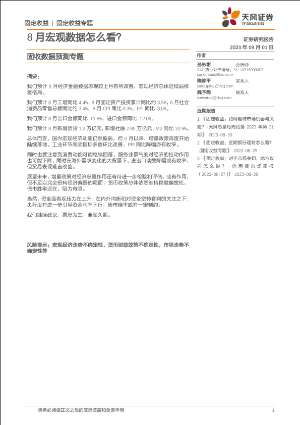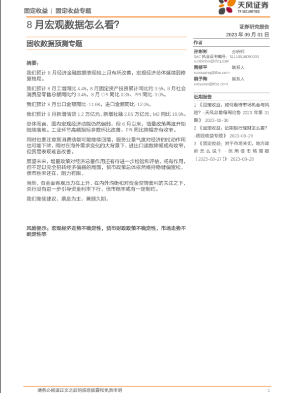 【天风证券】【20230901】固收数据预测专题:8月宏观数据怎么看?-20页