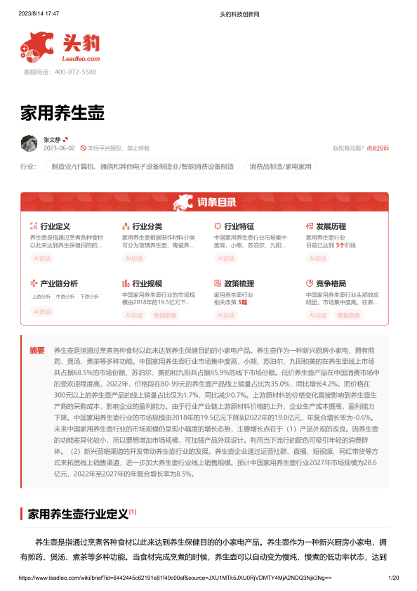 【头豹研究院】【20230814】家用养生壶 头豹词条报告系列-20页