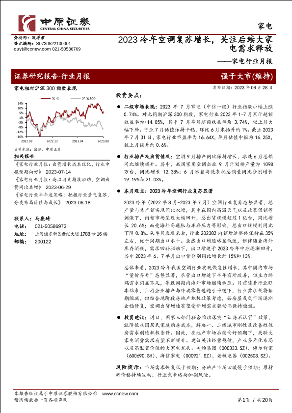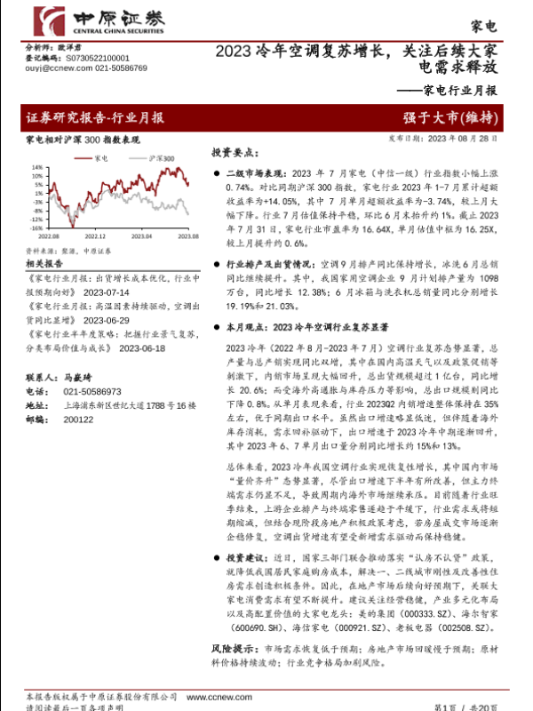 【中原证券】【20230828】家电行业月报:2023冷年空调复苏增长,关注后续大家电需求释放-20页