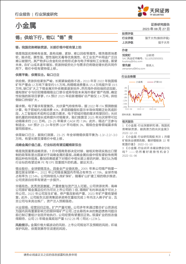 【天风证券】【20230827】小金属行业:锡,供给下行,物以“锡”贵-27页