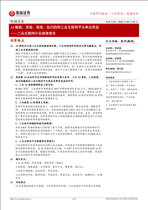 【浙商证券】【20230829】工业互联网行业深度报告:AI赋能,质检、视觉、低代码和工业互联网平台率先受益-26页