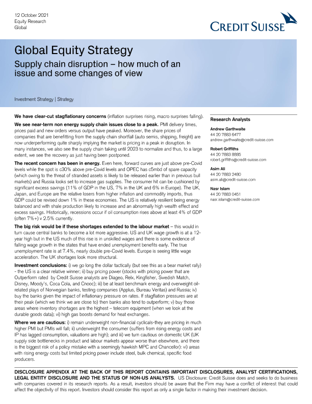 【瑞信(Credit Suisse)】【20211012】瑞信-全球投资策略-供应链中断:问题的严重程度和观点的某些变化-39页