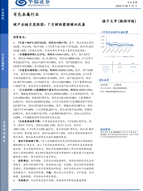 【华福证券】【20230827】有色金属行业锂产业链月度跟踪:7月锂供需继续双改善-18页