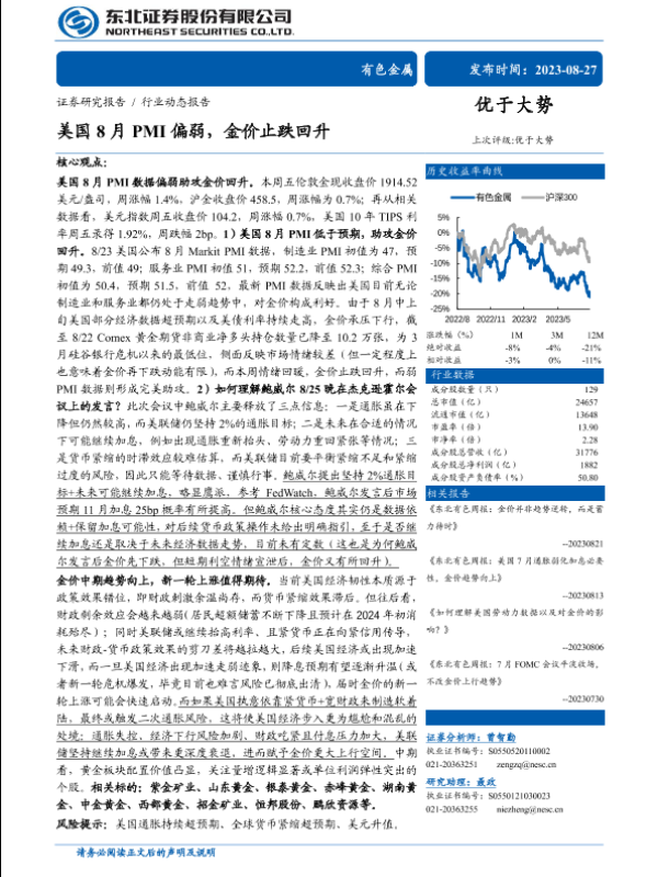 【东北证券】【20230827】美国8月PMI偏弱,金价止跌回升-24页