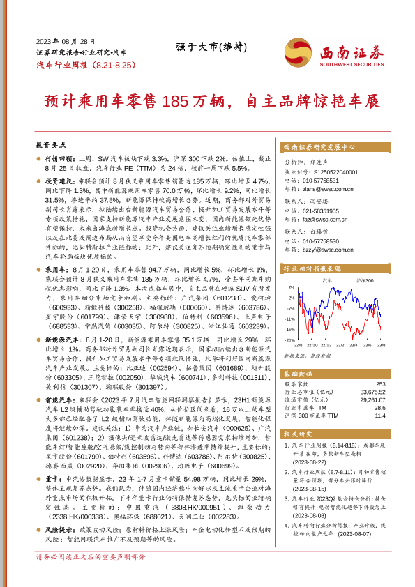 【西南证券】【20230828】汽车行业周报:预计乘用车零售185万辆,自主品牌惊艳车展-20页