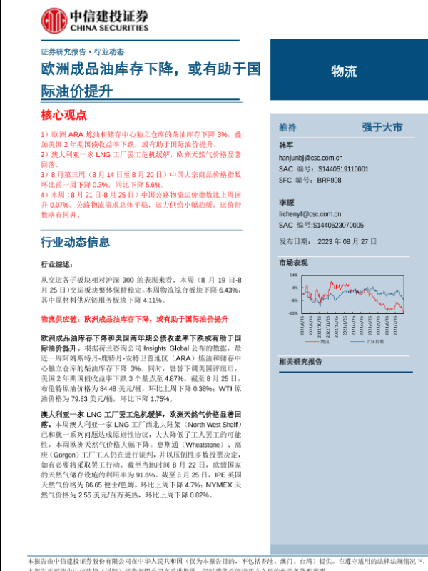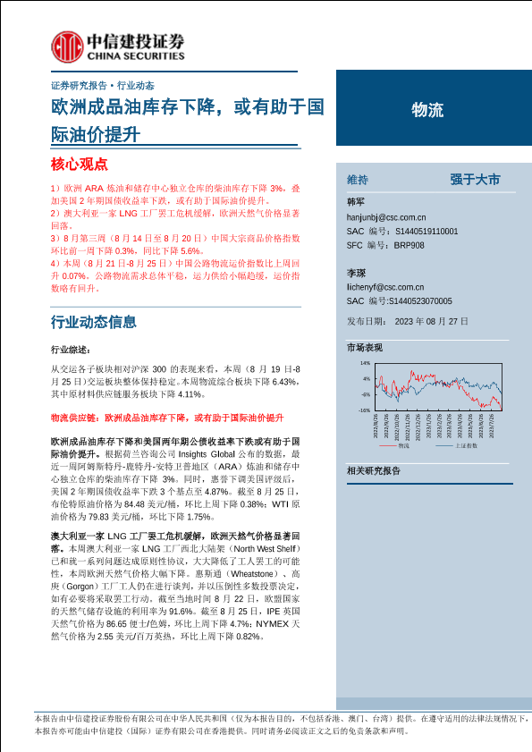 【中信建投证券】【20230827】物流行业动态:欧洲成品油库存下降,或有助于国际油价提升-17页