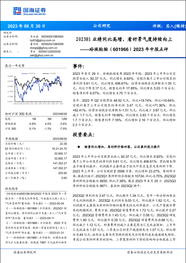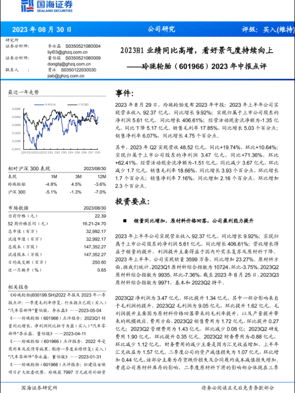 【国海证券】【20230830】玲珑轮胎-601966-2023年中报点评:2023H1业绩同比高增,看好景气度持续向上-15页