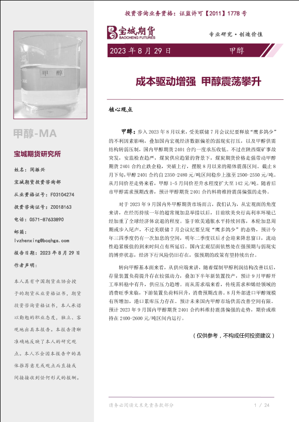 【宝城期货】【20230829】甲醇月报:成本驱动增强,甲醇震荡攀升-25页