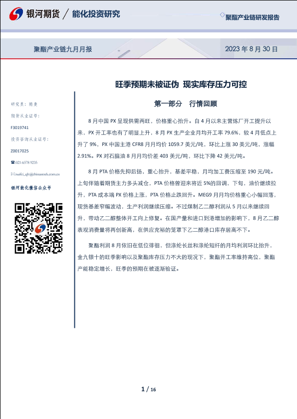 【银河期货】【20230830】聚酯产业链九月月报:旺季预期未被证伪,现实库存压力可控-16页