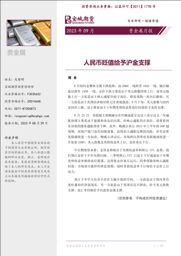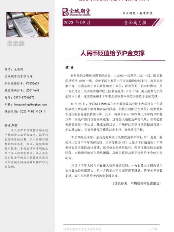 【宝城期货】【20230829】贵金属月报:人民币贬值给予沪金支撑-16页