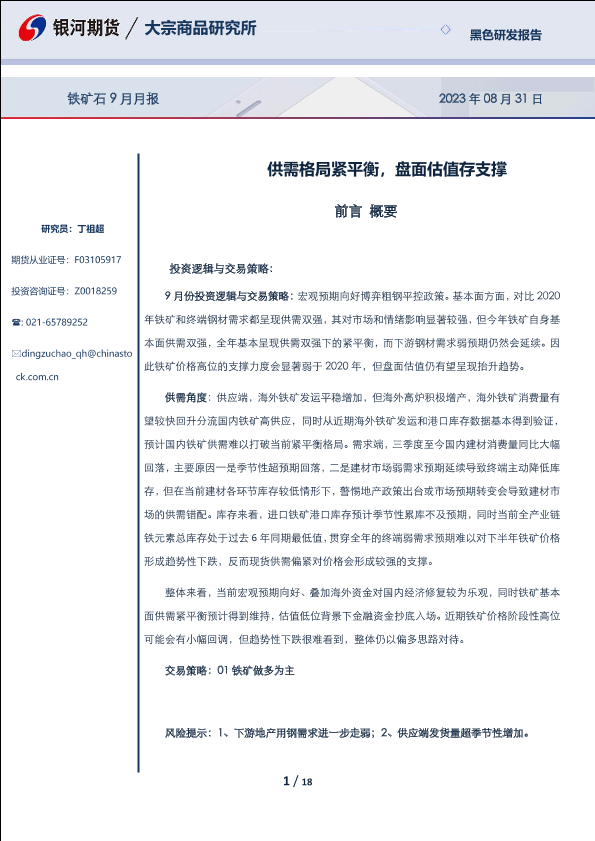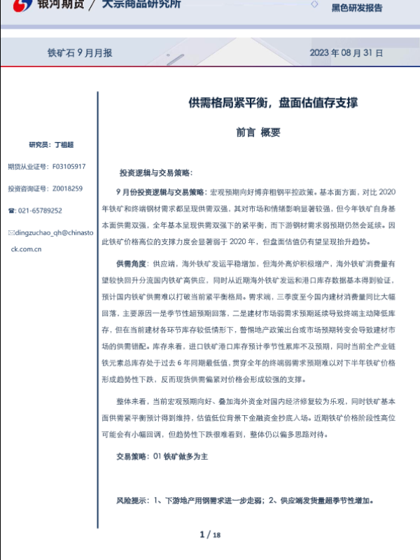 【银河期货】【20230831】铁矿石9月月报:供需格局紧平衡,盘面估值存支撑-18页