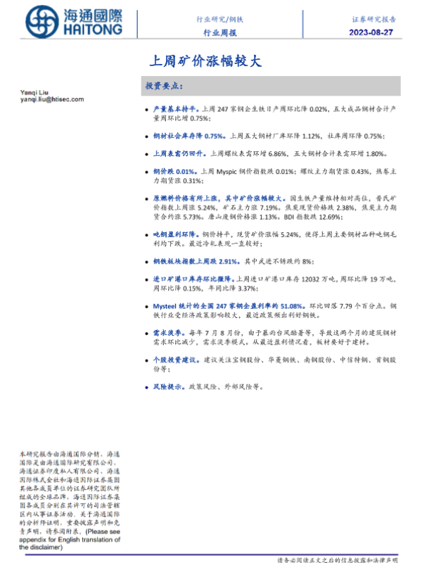 【海通国际】【20230827】钢铁行业周报:上周矿价涨幅较大-21页