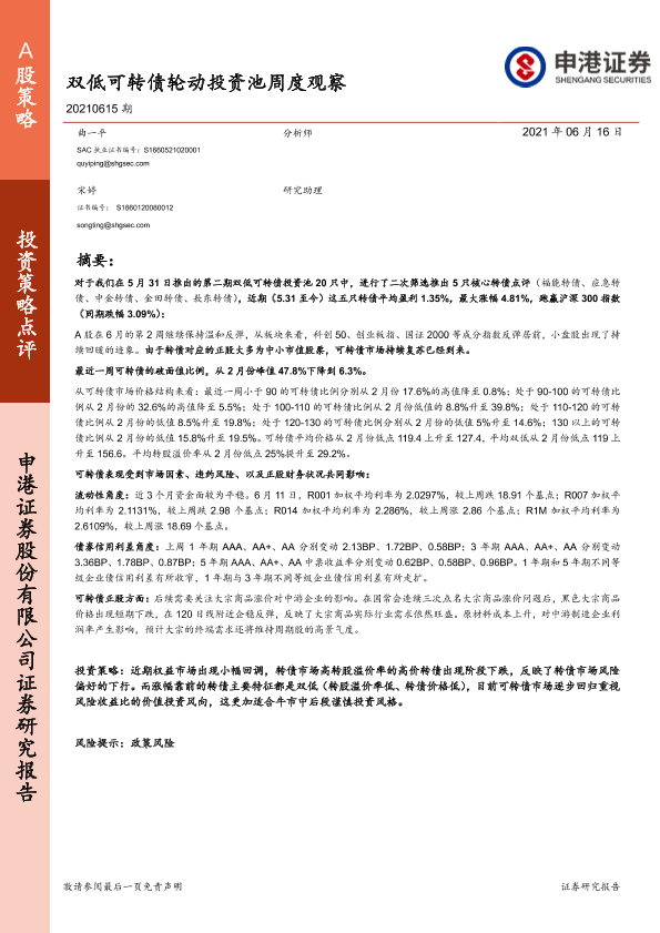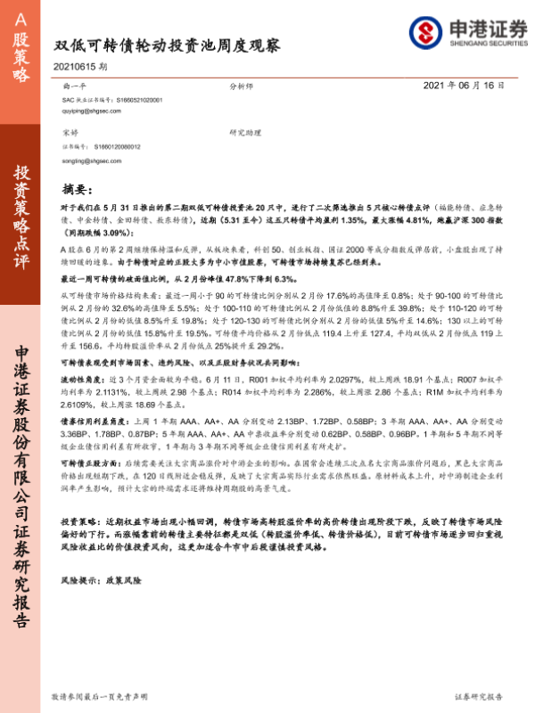 【申港证券】【20210616】投资策略点评:双低可转债轮动投资池周度观察-25页