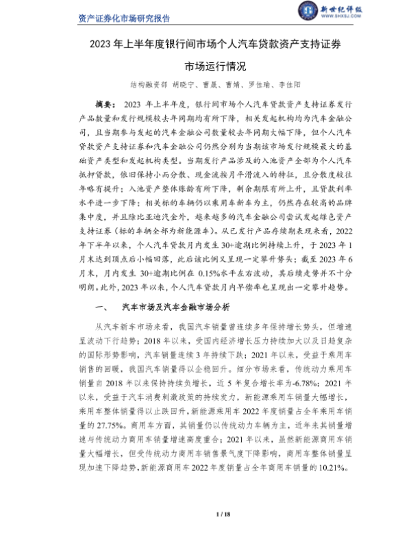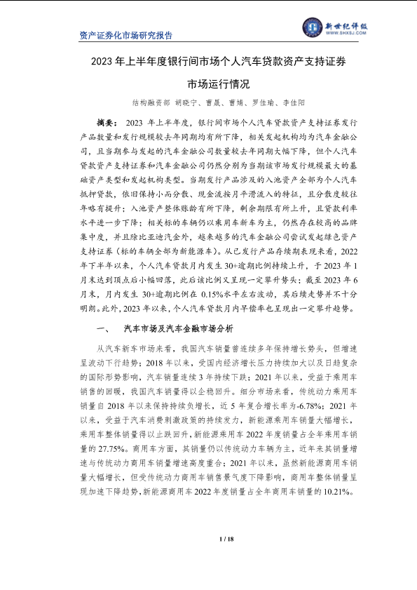 【新世纪评级】【20230630】2023年上半年度银行间市场个人汽车贷款资产支持证券市场运行情况-18页