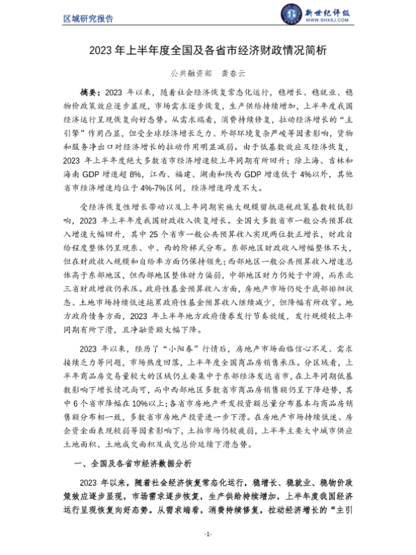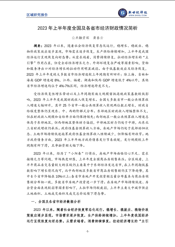 【新世纪评级】【20230630】2023年上半年度全国及各省市经济财政情况简析-13页