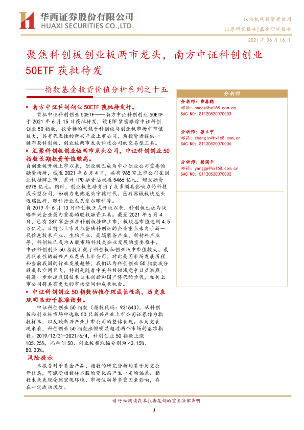 【华西证券】【20210616】指数基金投资价值分析系列之十五:聚焦科创板创业板两市龙头,南方中证科创创业50ETF获批待发-16页
