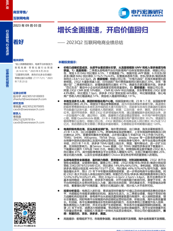 【申万宏源】【20230903】2023Q2互联网电商行业业绩总结:增长全面提速,开启价值回归-20页