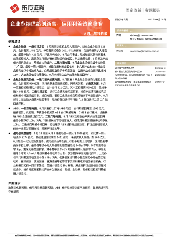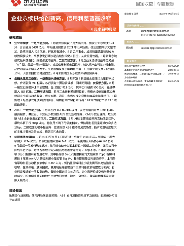 【东方证券】【20230905】8月小品种月报:企业永续供给创新高,信用利差普遍收窄-24页