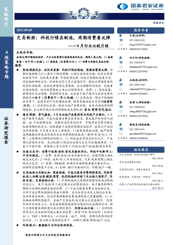 【国泰君安证券】【20230905】9月行业比较月报:交易制胜,科技行情在制造,周期消费看反弹-30页