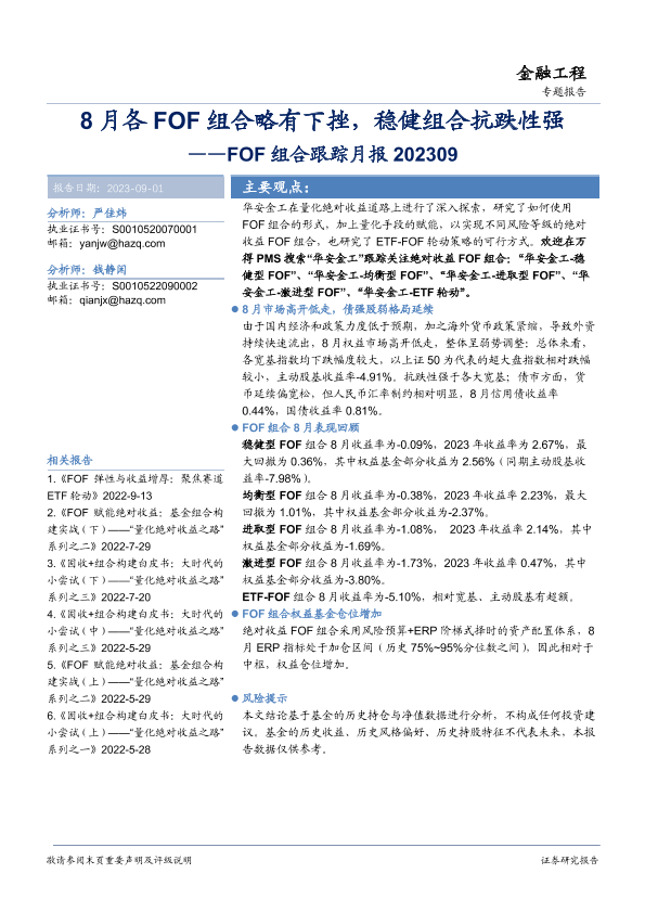 【华安证券】【20230901】FOF组合跟踪月报:8月各FOF组合略有下挫,稳健组合抗跌性强-16页
