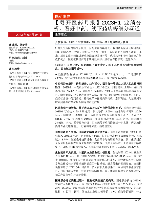 【粤开证券】【20230904】【粤开医药行业月报】2023H1业绩分析,看好中药、线下药店等细分赛道-24页