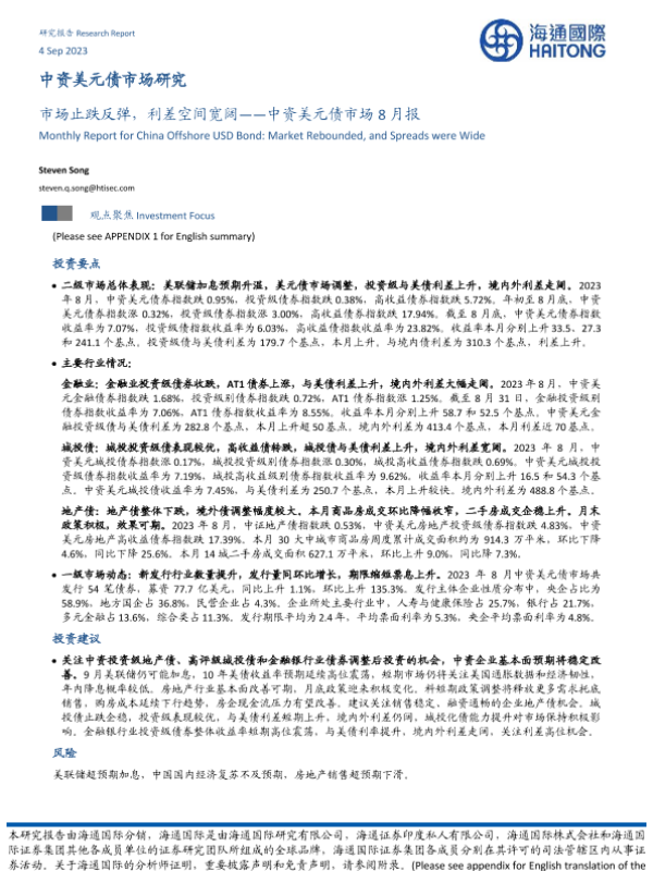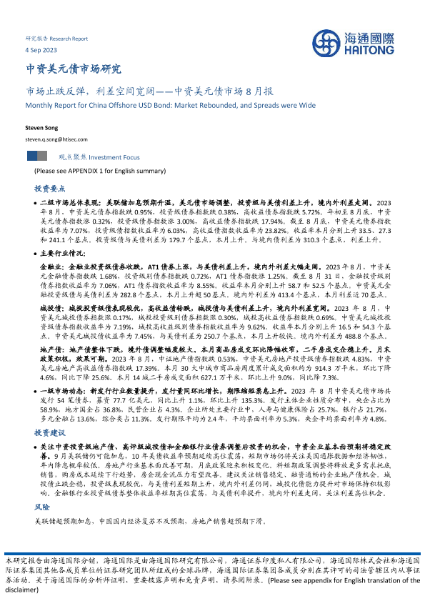 【海通国际】【20230904】中资美元债市场8月报:市场止跌反弹,利差空间宽阔-21页
