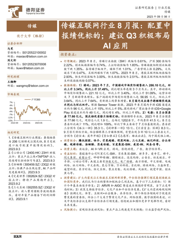 【德邦证券】【20230906】传媒互联网行业8月报:配置中报绩优标的;建议Q3积极布局AI应用-29页