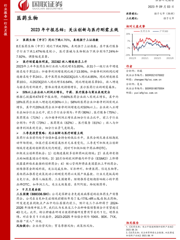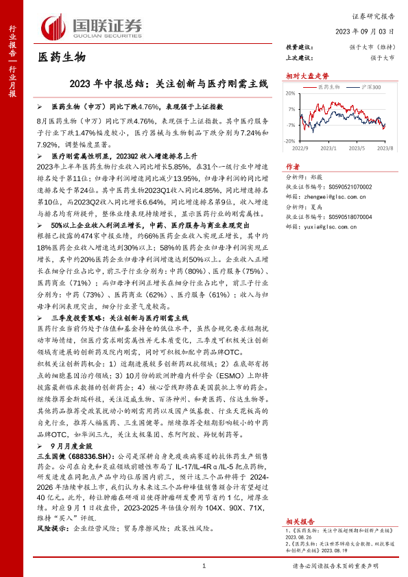 【国联证券】【20230903】医药生物行业2023年中报总结:关注创新与医疗刚需主线-33页