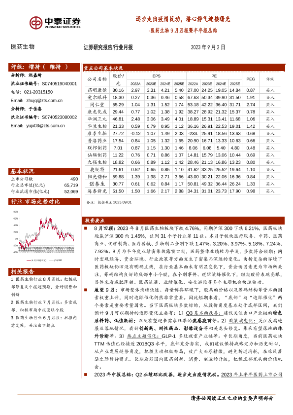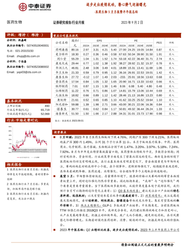 【中泰证券】【20230902】医药生物行业9月月报暨半年报总结:逐步走出疫情扰动,潜心静气迎接曙光-26页
