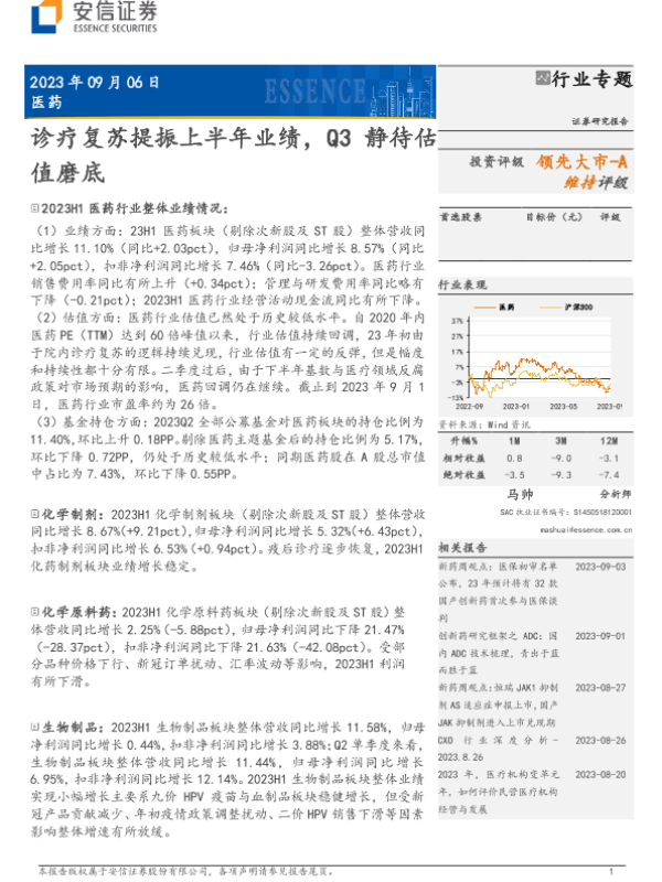 【安信证券】【20230906】医药行业专题:诊疗复苏提振上半年业绩,Q3静待估值磨底-27页
