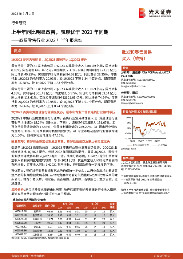 【光大证券】【20230901】商贸零售行业2023年半年报总结:上半年同比明显改善,表现优于2021年同期-21页