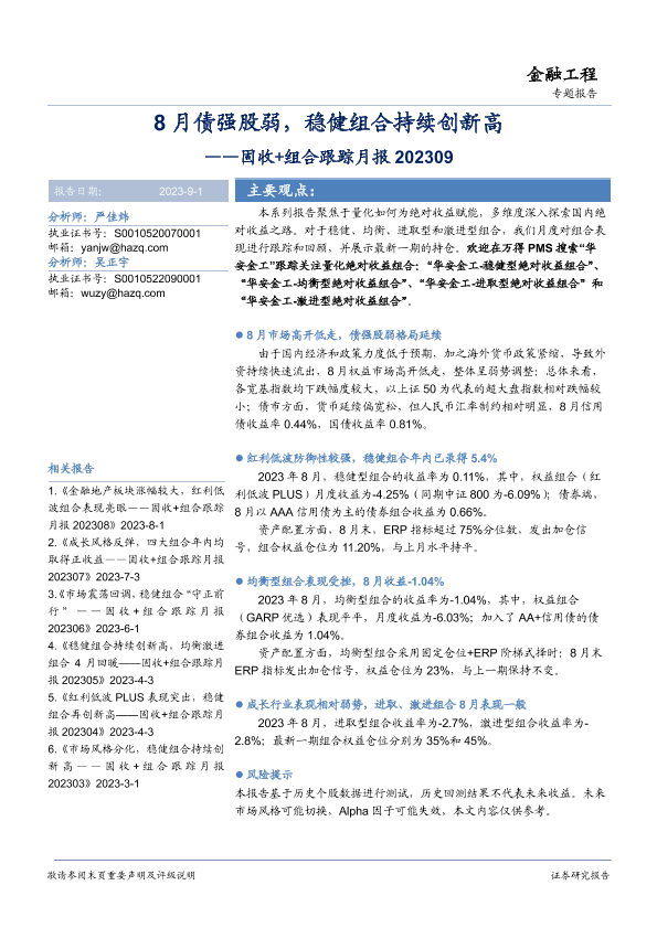 【华安证券】【20230901】固收+组合跟踪月报:8月债强股弱,稳健组合持续创新高-15页