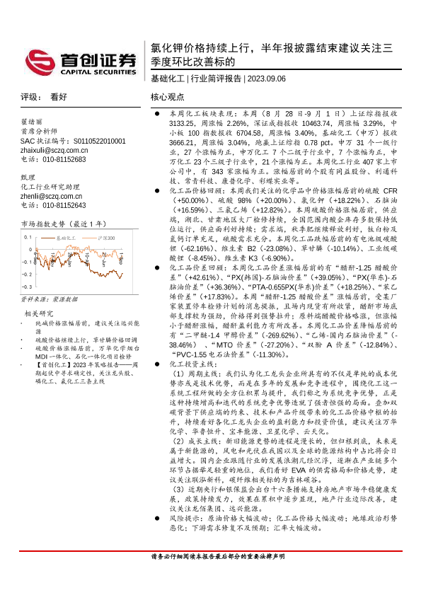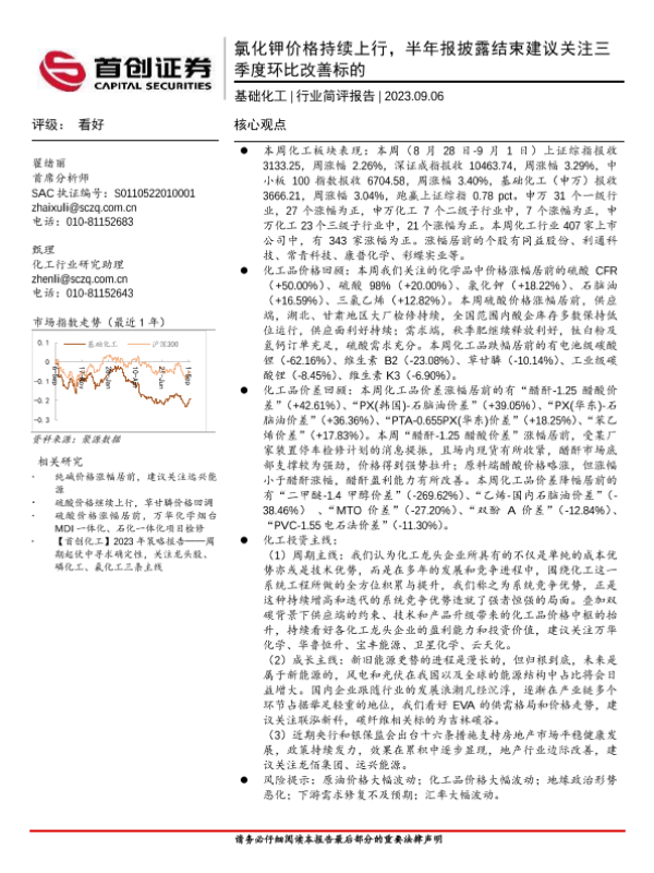 【首创证券】【20230906】基础化工行业简评报告:氯化钾价格持续上行,半年报披露结束建议关注三季度环比改善标的-20页