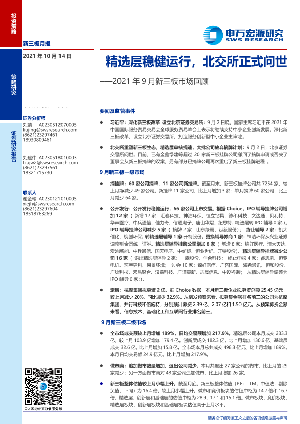 【申万宏源】【20211014】2021年9月新三板市场回顾:精选层稳健运行,北交所正式问世-21页