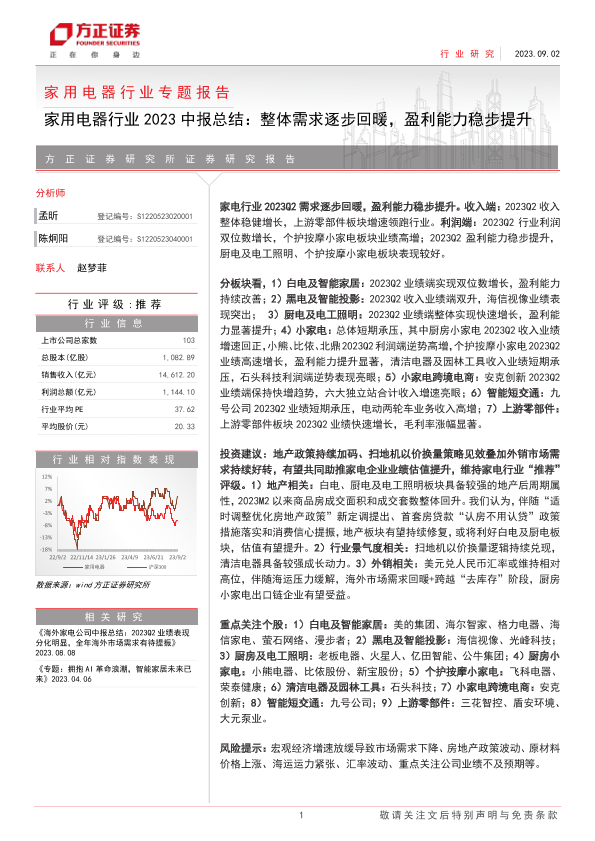 【方正证券】【20230902】家用电器行业2023中报总结:整体需求逐步回暖,盈利能力稳步提升-24页