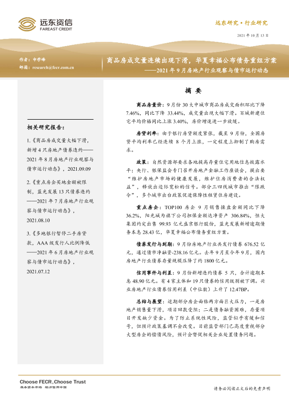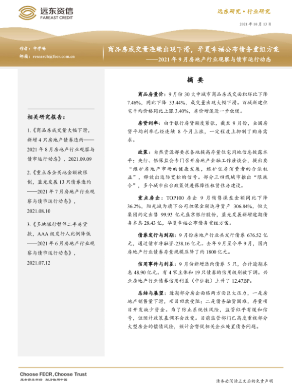 【远东资信】【20211013】2021年9月房地产行业观察与债市运行动态:商品房成交量连续出现下滑,华夏幸福公布债务重组方案-23页