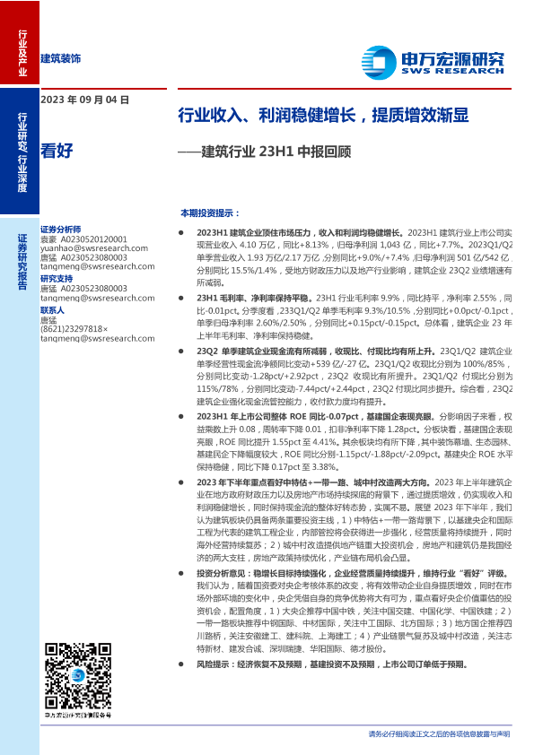 【申万宏源】【20230904】建筑行业23H1中报回顾:行业收入、利润稳健增长,提质增效渐显-20页