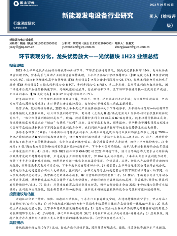 【国金证券】【20230902】新能源发电设备行业光伏板块1H23业绩总结:环节表现分化,龙头优势放大-26页