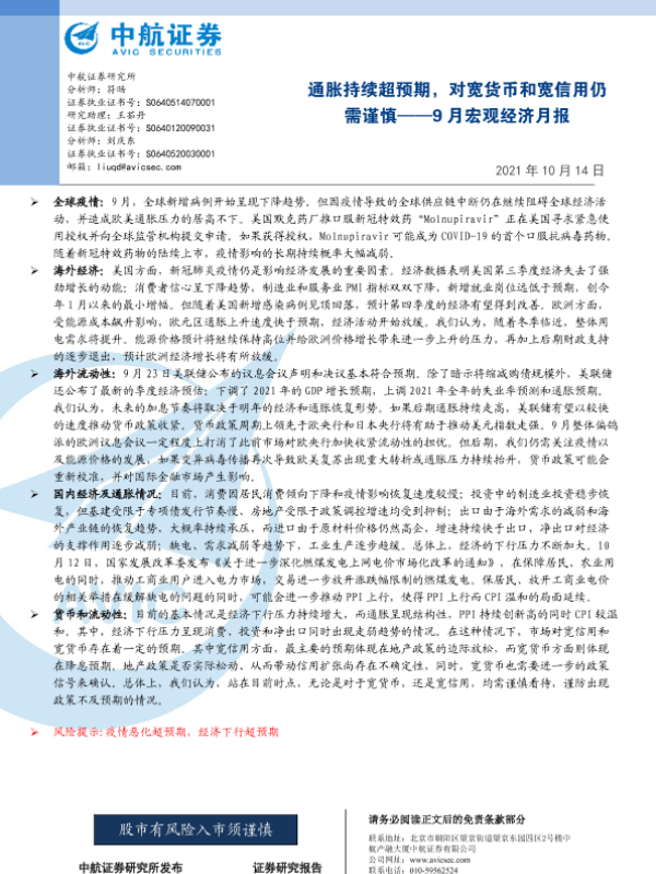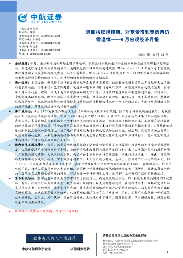 【中航证券】【20211014】9月宏观经济月报:通胀持续超预期,对宽货币和宽信用仍需谨慎-20页