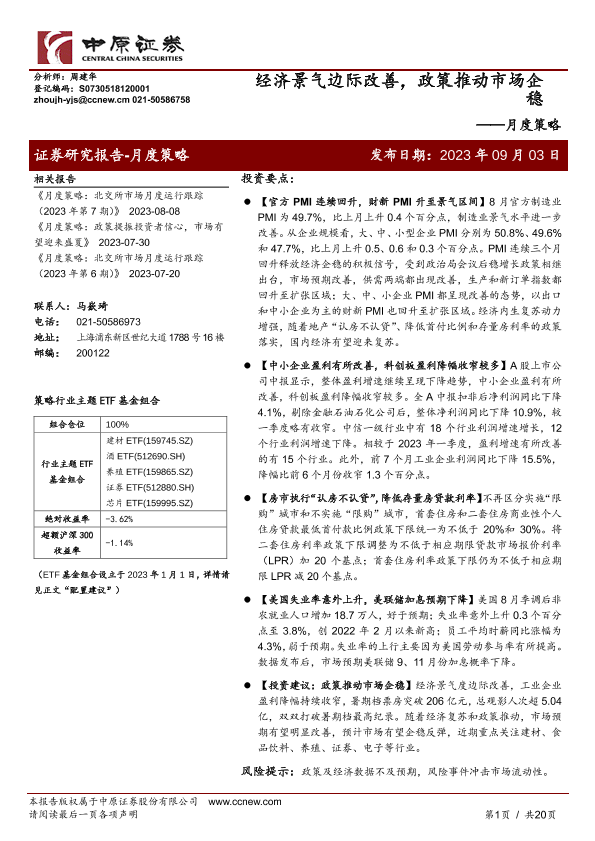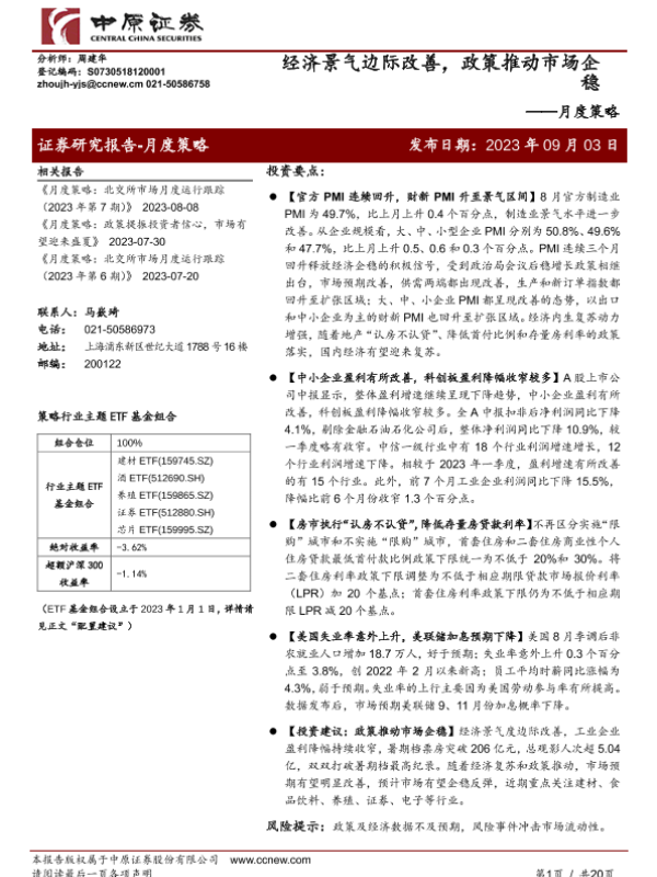 【中原证券】【20230903】月度策略:经济景气边际改善,政策推动市场企稳-20页
