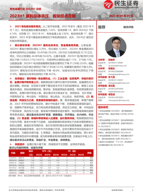 【民生证券】【20230905】有色金属行业2023H1总结:2023H1盈利总体承压,板块拐点在即-54页