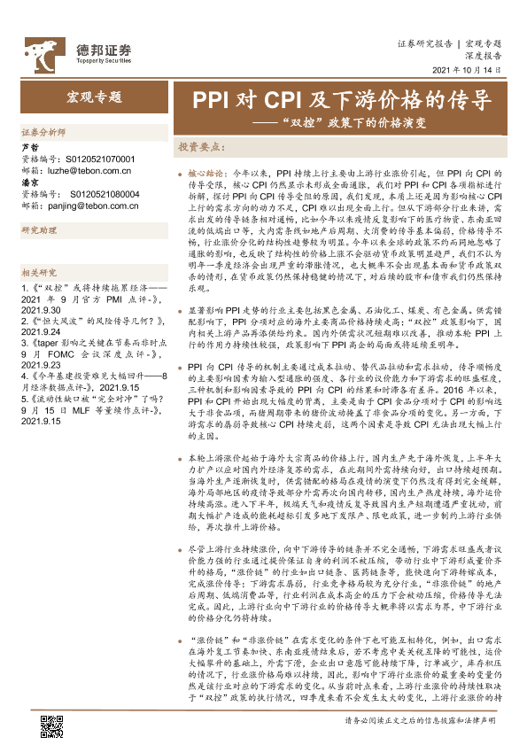 CPI PPI 价格传导 双控政策 宏观经济