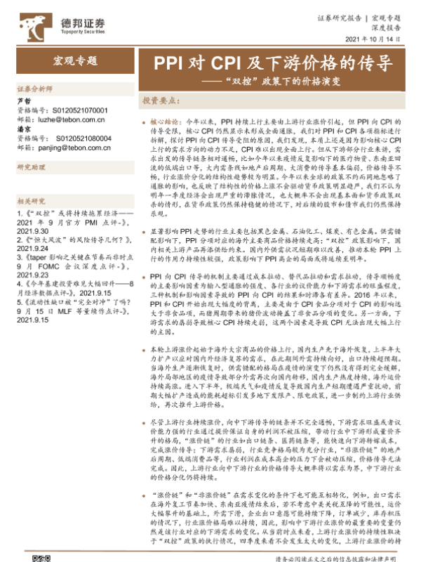 【德邦证券】【20211014】“双控”政策下的价格演变:PPI对CPI及下游价格的传导-21页