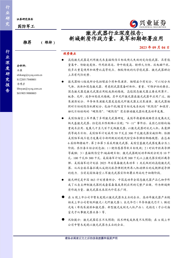 【兴业证券】【20230904】激光武器行业深度报告:新域新质作战力量,美军初期部署应用-41页