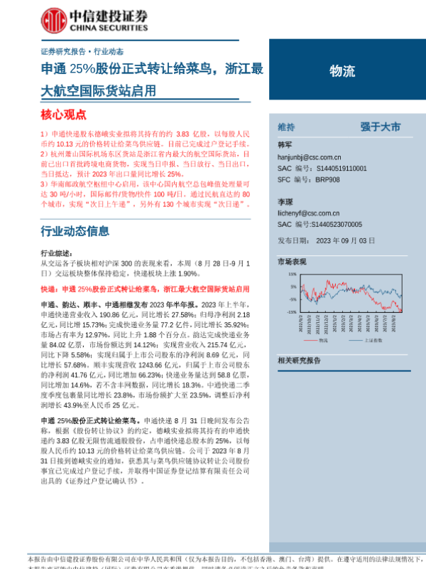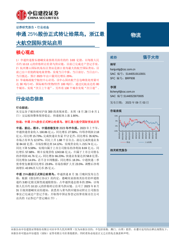 【中信建投证券】【20230903】物流行业:申通25%股份正式转让给菜鸟,浙江最大航空国际货站启用-24页
