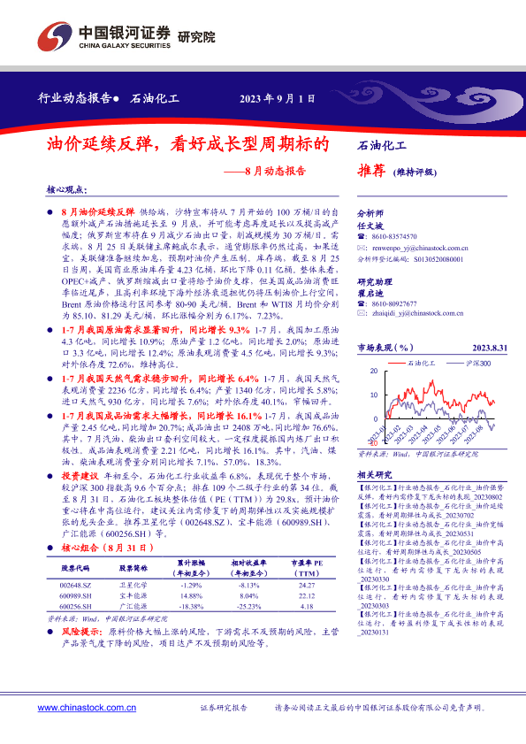 【银河证券】【20230901】石油化工行业8月动态报告:油价延续反弹,看好成长型周期标的-24页