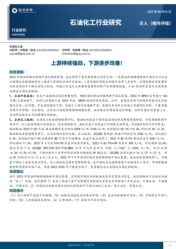 【国金证券】【20230901】石油化工行业研究:上游持续强劲,下游逐步改善!-21页