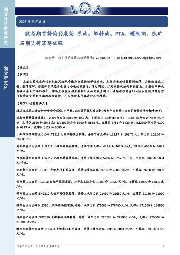 【国泰君安期货】【20230906】股指期货将偏弱震荡,原油、燃料油、PTA、螺纹钢、铁矿石期货将震荡偏强-43页