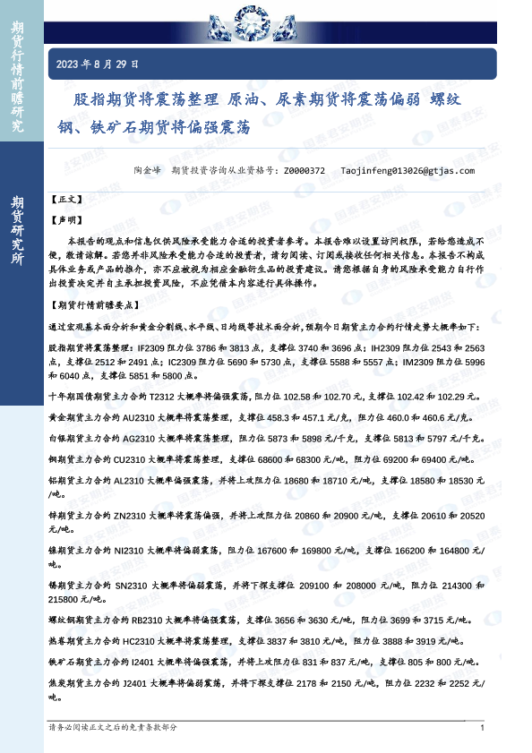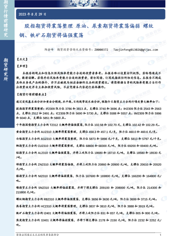 【国泰君安期货】【20230829】股指期货将震荡整理,原油、尿素期货将震荡偏弱,螺纹钢、铁矿石期货将偏强震荡-38页