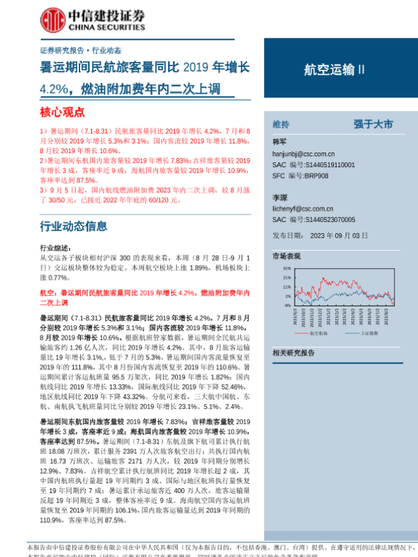 【中信建投证券】【20230903】航空运输Ⅱ行业:暑运期间民航旅客量同比2019年增长4.2%,燃油附加费年内二次上调-25页